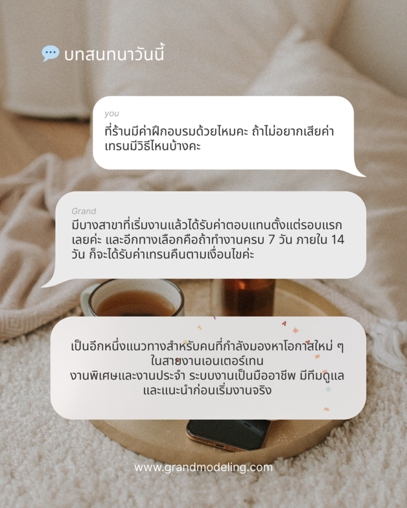 ไม่สวยมาก…ก็จับเงินแสนได้ที่นี่ Grand Modelingอิสระเข้างานได้สะดวก ไม่บังคับวันทำงานติดต่อเรา พริตตี้สปางานง่าย เงินดี แขกวีไอพี ทุกที่ทั่วกรุงเทพและปริมณฑล ติดต่อเรา ทำไมต้อง Grand Modeling สถานที่สะอาด ปลอดภัย ทั่วกรุงเทพ ข้อมูลเป็นความลับ 100% ทีมงานมืออาชีพ คัดกรองลูกค้าให้ รายได้รับเงินสดๆ ทุกวันก่อนกลับบ้าน เพศยินดีต้อนรับสาวสองแปลงเพศ, ทอม, ดี้ ลูกค้าเกรดดี ทิปหนัก เจ้าของธุรกิจ ฯลฯ ฟรีที่พักทุกที่ สะดวกสบาย รีวิวเพิ่มเติม สมัครเลย โซนร้านมีโซนร้านให้เลือกทั่วกรุงเทพได้ตามความสะดวก ติดต่อเรา เมืองทอง ลาดพร้าว23 พัฒนาการ30 ราชพฤกษ์ กัลปพฤกษ์-สาทร นาคนิวาส-เกษตรนวมินทร์ คู้บอน – พระยาสุเรนทร์ Testimonials Amanda DoeAustralia Lorem ipsum dolor sit amet, consectetur adipiscing elit. Ut elit tellus, luctus nec ullamcorper mattis, pulvinar dapibus leo ★★★★★ Jenny SmithNew York Lorem ipsum dolor sit amet, consectetur adipiscing elit. Ut elit tellus, luctus nec ullamcorper mattis, pulvinar dapibus leo ★★★★★ รีวิว ดูเพิ่มเติม “ ไม่สวยมาก… ก็จับเงินแสนได้ที่นี่”เอาใจฟิลแฟนแต่ไม่ถึงขนาดมีเพศสัมพันธ์ติดต่อเรา Tiktok ของเรา เข้าชม Tiktok อัปเดตข่าวสาร